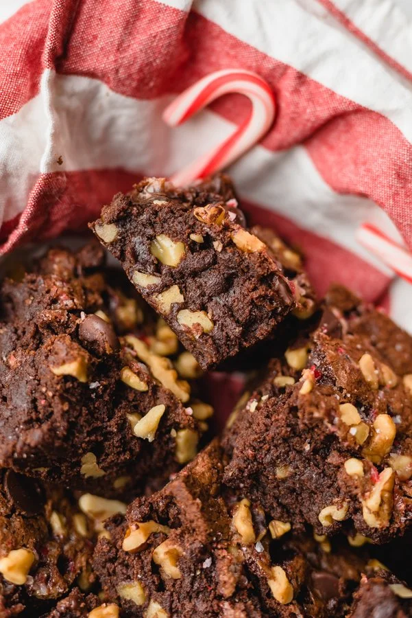 I call these βHoliday Browniesβ because they are meant to be festive; from sprinkles, candy canes, you name it, these brownies can be decorated any way the heart desires. I decided to add walnuts to the brownie base and then top them with additional walnuts, bittersweet chocolate chips and crushed candy canes. The peppermint flavor wasnβt overpowering, but they were still Christmas forward and the perfect holiday dessert. Letβs dive into what makes these brownies special.